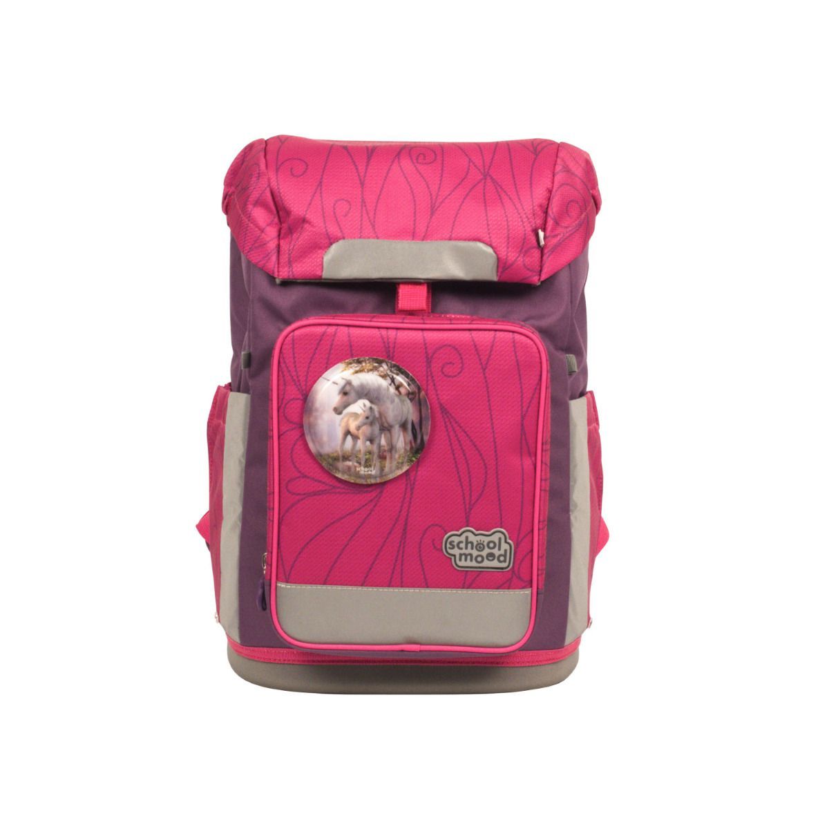- School Mood Schulrucksack (pink, lila) - Der School Mood Schulrucksack ist für kleine und große Kinder gleichermaßen geeignet. Dank seiner einzigartigen Schultergurtführung wächst der Schulrucksack von einer Körpergröße von ca. 1,00 m bis 1,50 m mit. Das ergonomische Prinzip ist gekennzeichnet durch ein rückenschönend geformtes und atmungsaktives Rückenpolster, verstellbare Schultergurte, einen Brustgurt und einem Beckengurt. Das geräumige Hauptfach mit Bücherfach, eine isolierte Reißverschlussfrontasche für die Brotdose und zwei Seitentaschen für die Trinkflasche oder den Regenschirm, ermöglichen eine praktische Organisation der Schulmaterialien. Der Tunnelzug sorgt für einen zusätzlichen Kompressionseffekt. Unter dem Deckel befindet sich Platz für den Stundenplan. An der Beckenflosse befindet sich ein kleines Reißverschluss-Fach. Hochwertiger selbstschließender „FidLock“ Magnetverschluss für kinderleichtes Öffnen und Schließen. Der standfeste Boden bietet Schutz vor Nässe. Eine Vielzahl retroreflektierende Flächen (Oralite®), bieten Ihrem Schulkind zusätzliche Sicherheit im Straßenverkehr.